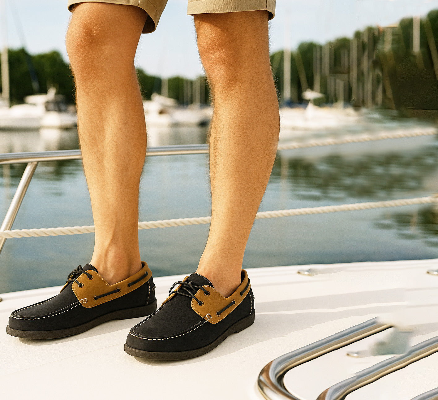 These lace-up deck shoes feature a distinctive two-tone design that adds character to your nautical-inspired look. The flat sole ensures steady footing and all-day comfort, whilst the classic boat shoe silhouette offers timeless appeal. Perfect for casual outings, weekend adventures, or smart-casual occasions, these sailing loafers are expertly crafted with attention to detail. The practical lace-up closure provides a secure, adjustable fit, making them ideal for various foot shapes. Whether you're strolling along the marina or attending a casual gathering, these deck shoes deliver both style and functionality. Their versatile design pairs wonderfully with chinos, jeans, or shorts, making them a valuable addition to any gentleman's footwear collection.