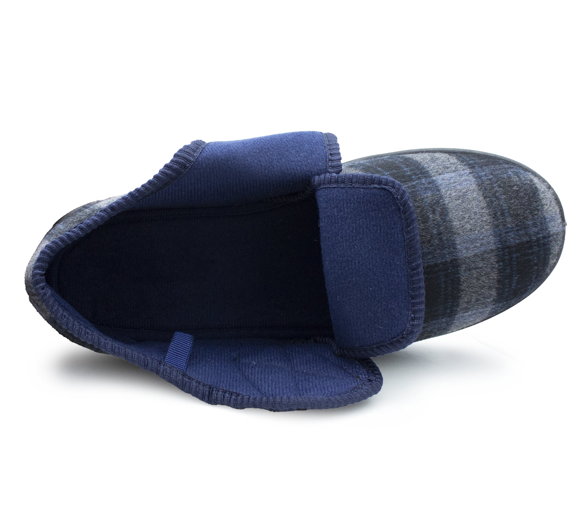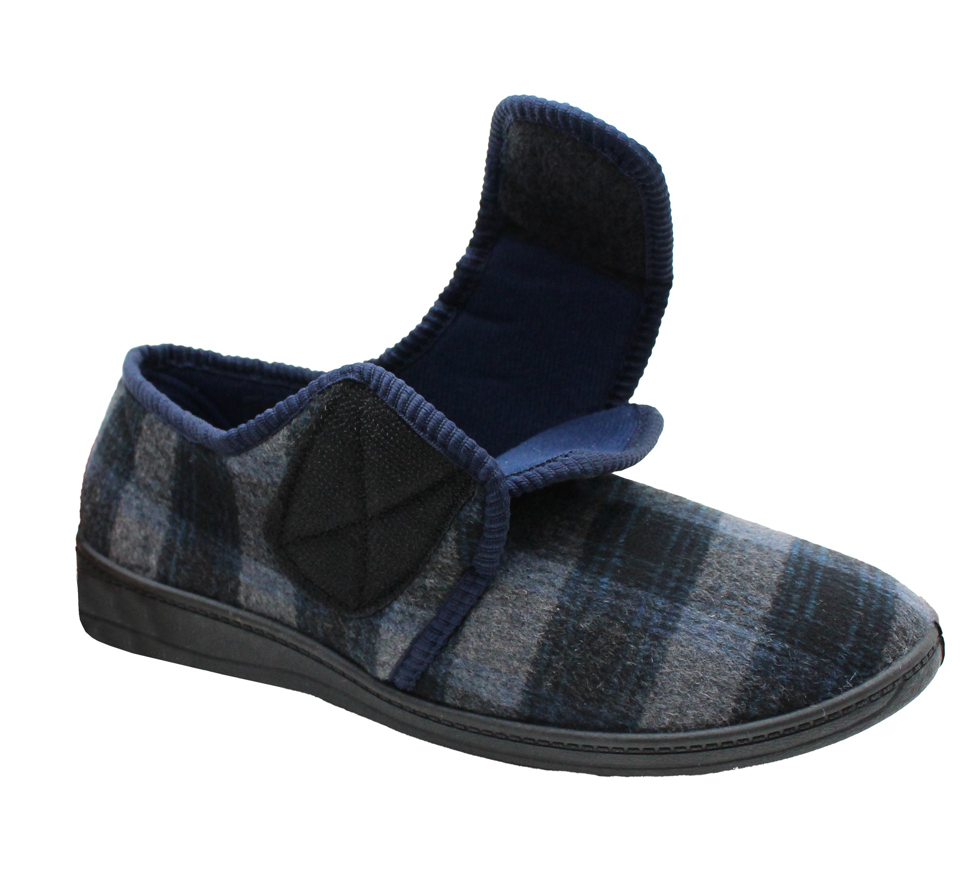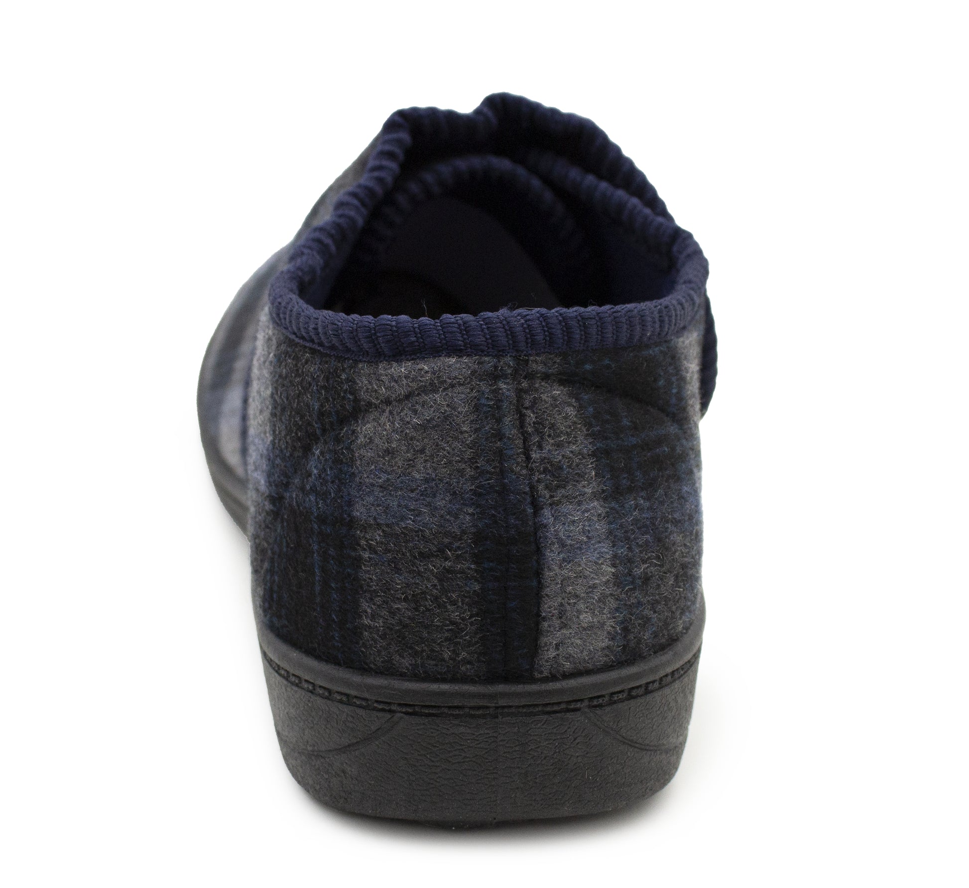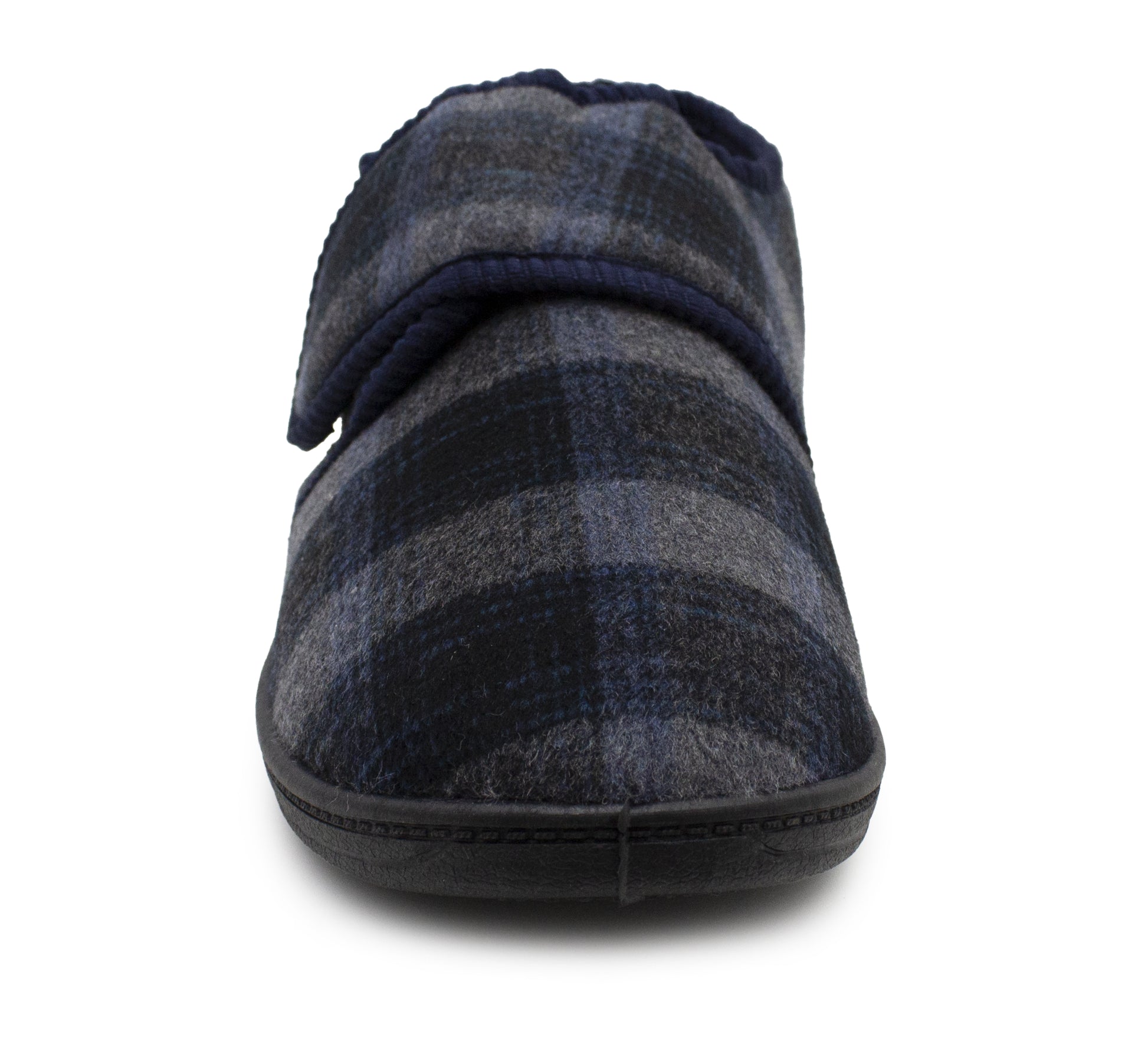 Mens Touch Fasten Slippers Navy Blue Check Felt Wide Opening House Shoes Casual Comfort Indoor Slipper
