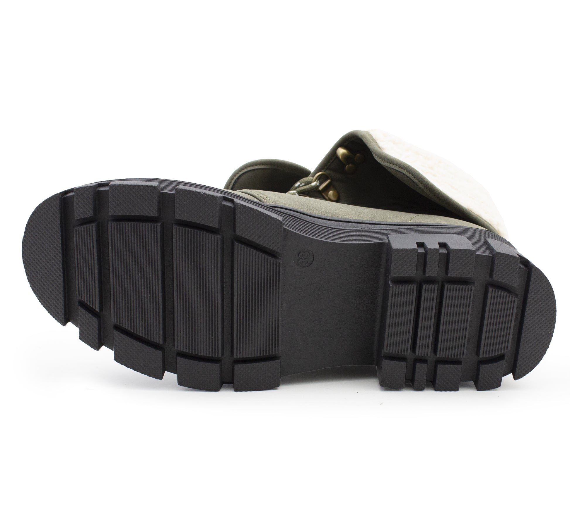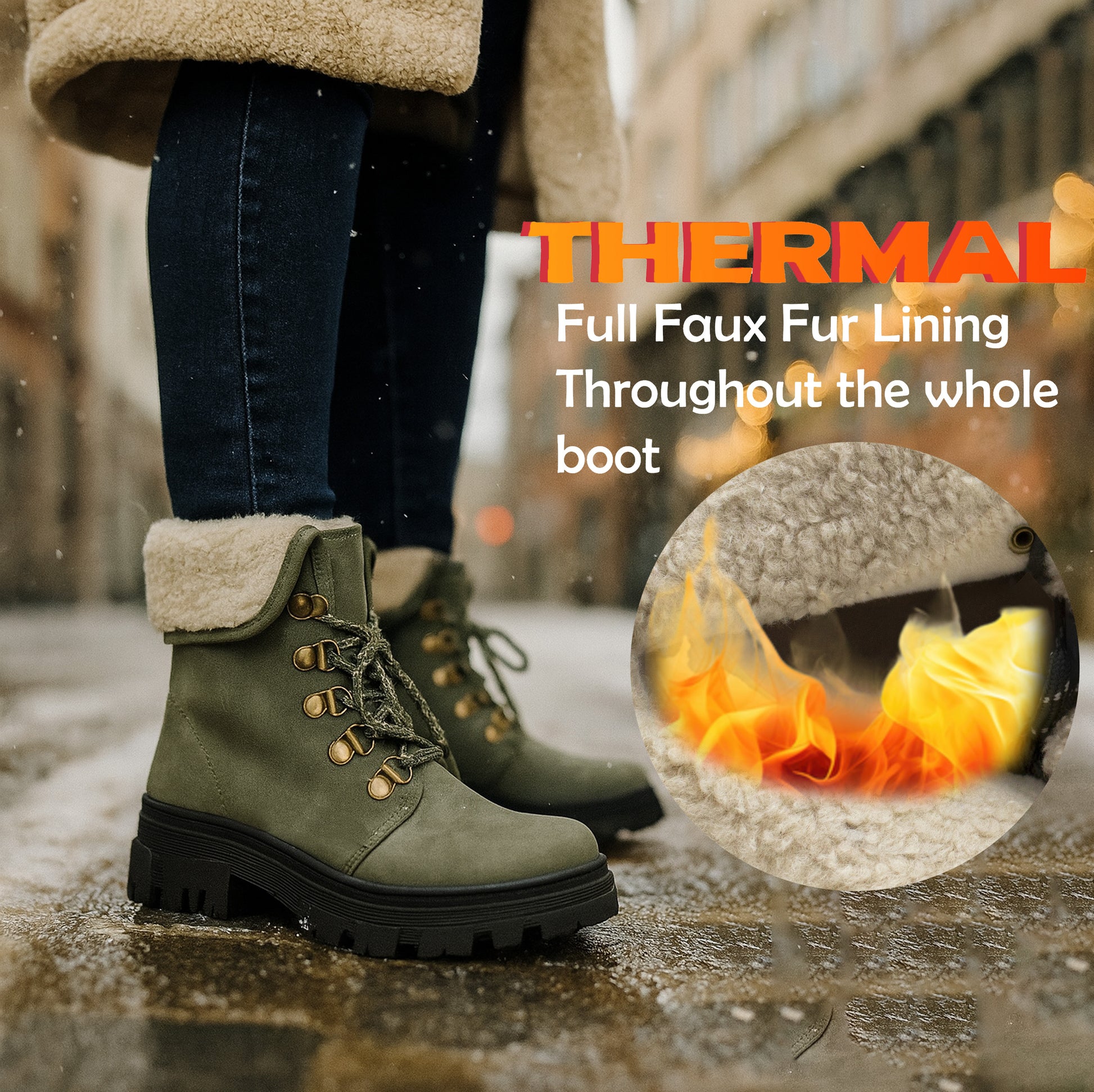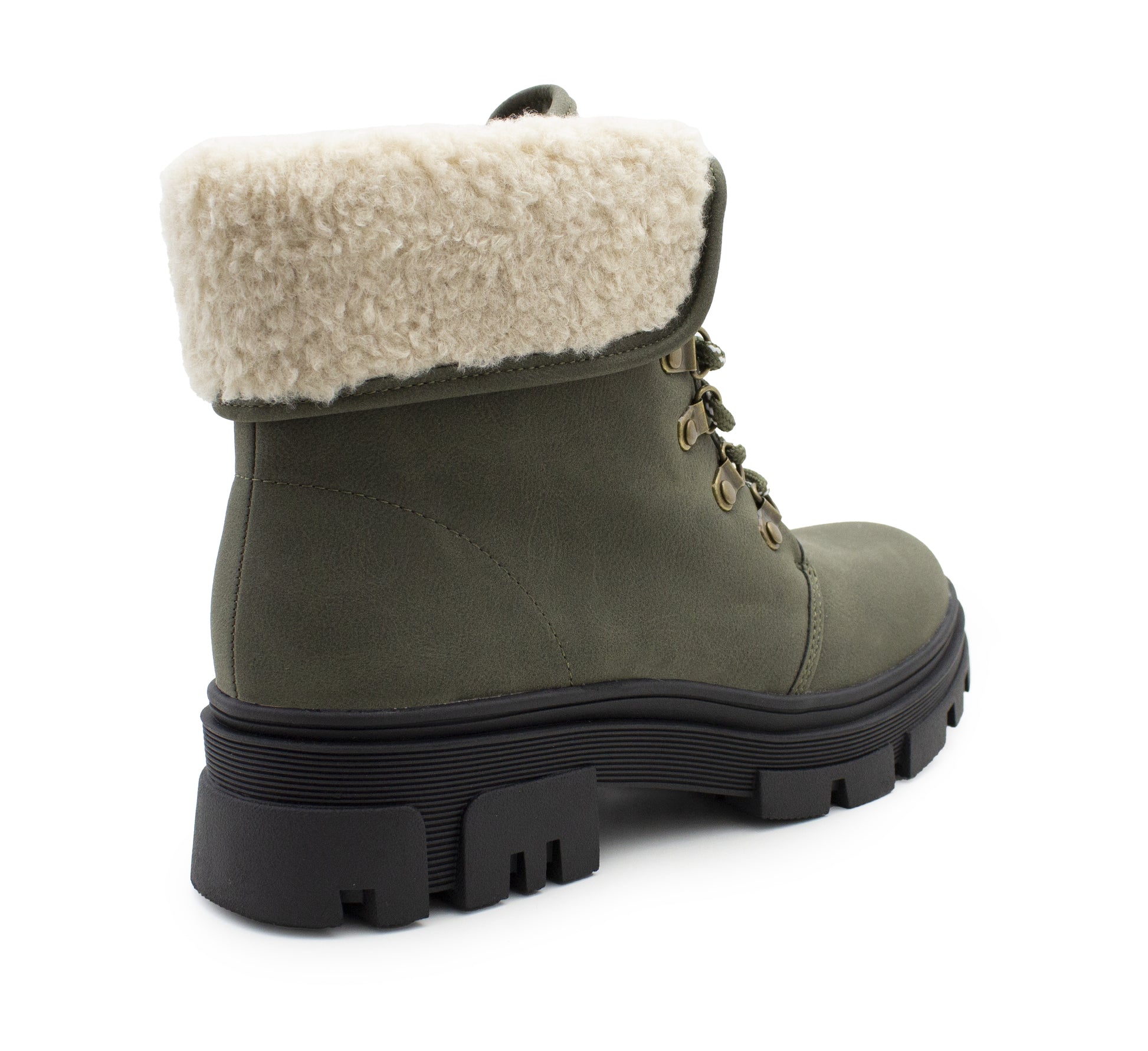 Womens Khaki Winter Ankle Boots Chunky Sole Platform Faux Fur Lined Warm Fleece Trim Ladies High Top Hiking Combat Fashion Boots
