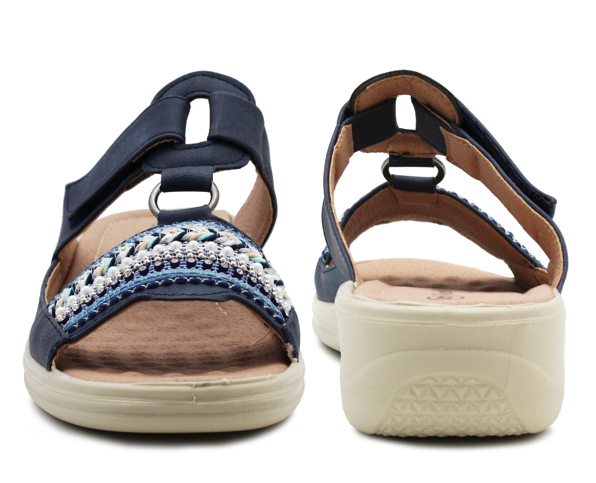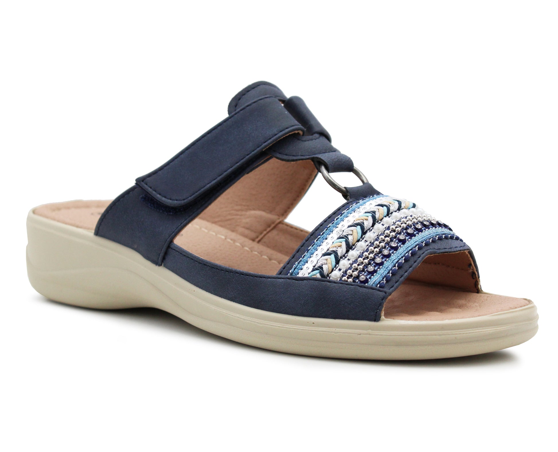 Womens Touch Fasten Sandals Low Wedge Diamante Open Toe Slip On Backless Ladies Summer Fashion Sandals in Navy