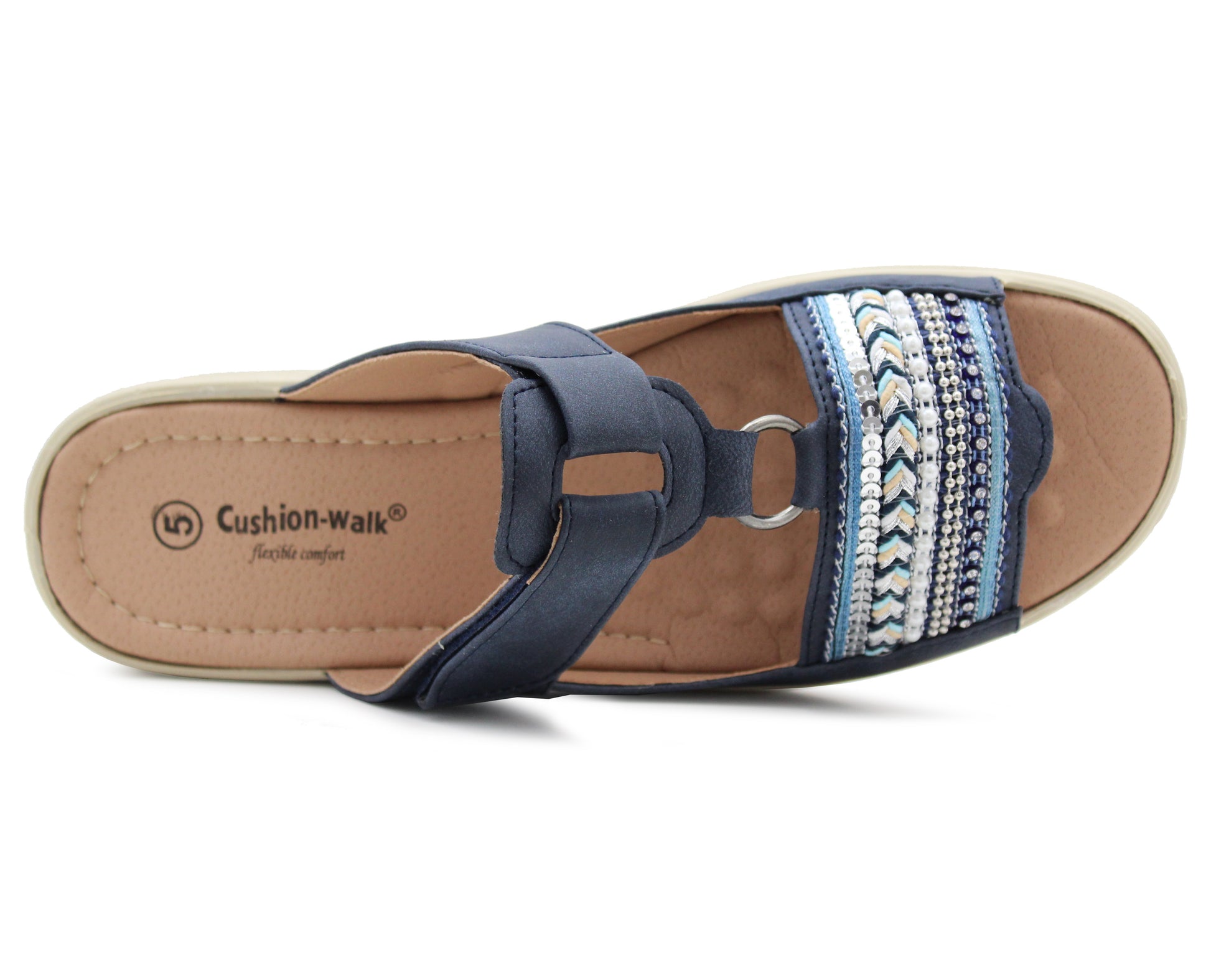 Cushion Walk Diamante Upper Design. Low Wedge Heel. Backless mules with a touch fasten strap. Slip On & Off with ease. These beautiful sandals are an essential addition to your wardrobe's Summer Collection! Multipurpose – can be worn for many different occasions, long walks in the sun, relaxing beach days, by the pool side, garden & leisure or just casual everyday wear!