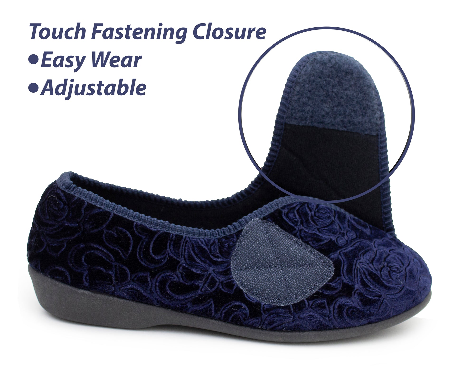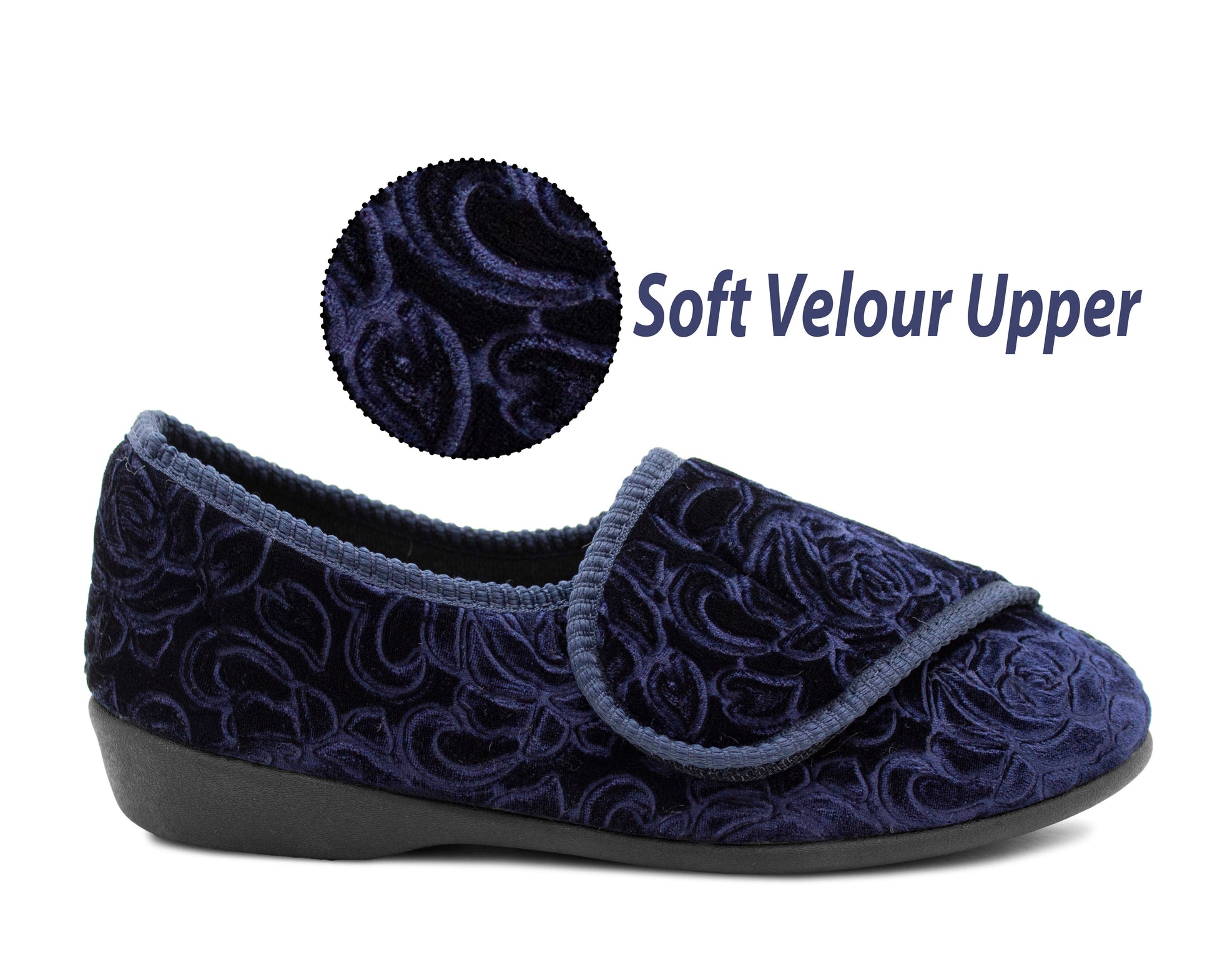 Womens Wide Opening Slippers Navy Velour Touch Fasten Diabetic Orthopaedic Slip On House Shoes Flat Comfort Bedroom Shoes
