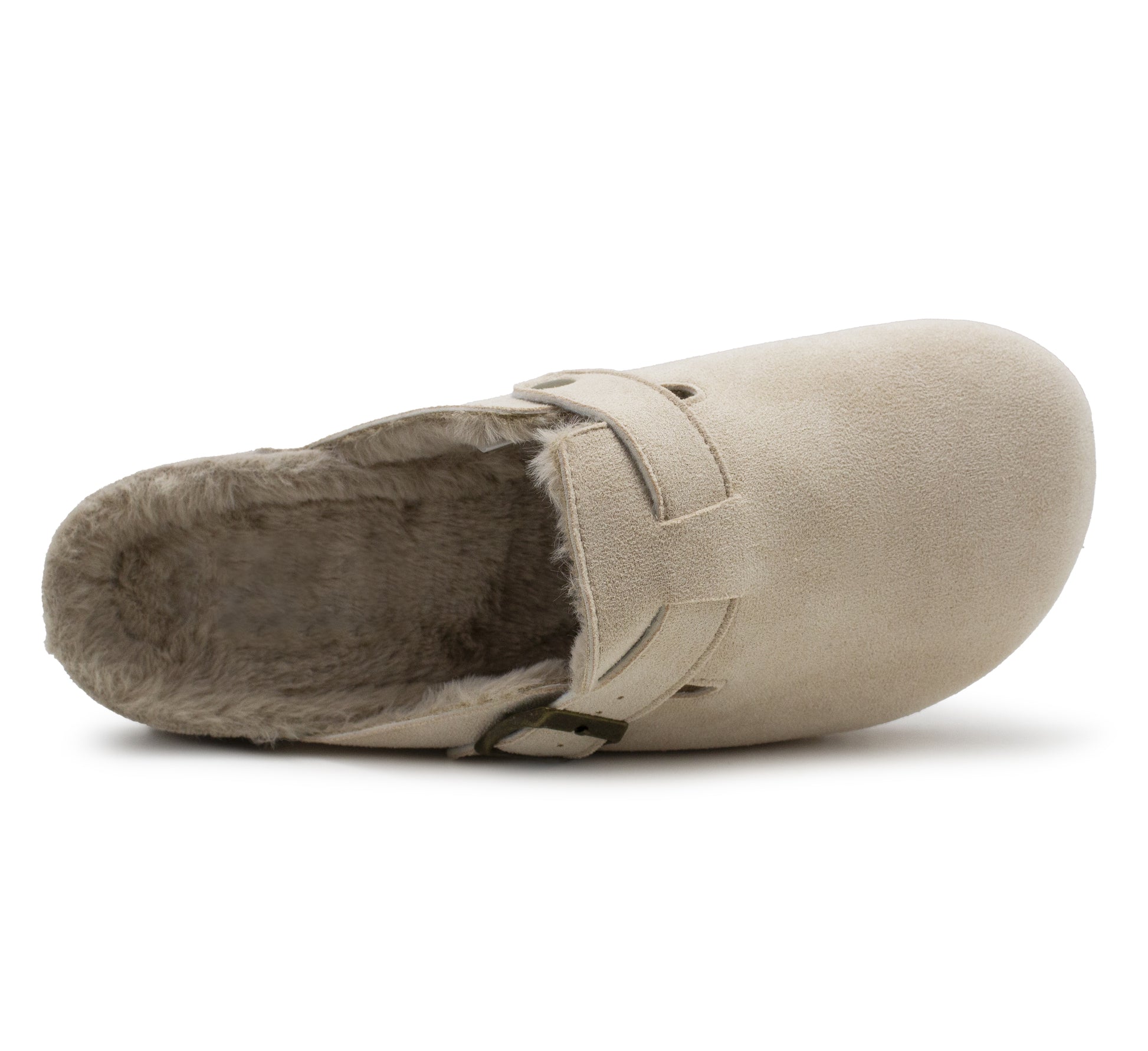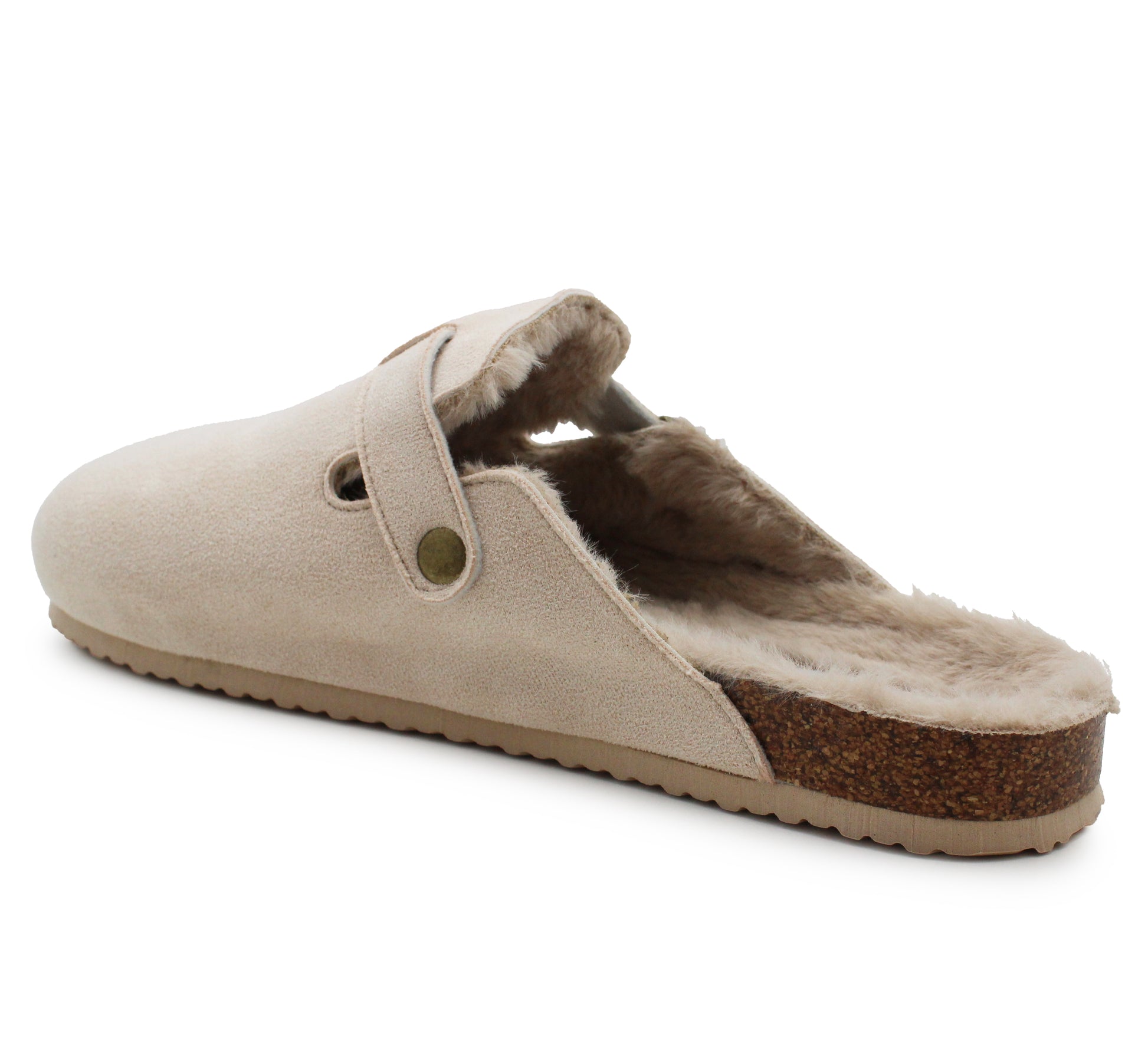 Womens Winter Beige Slippers Faux Fur Lined Suede Clogs Slip On Adjustable Buckle Cork Footbed Backless Mules Ladies Casual Slippers